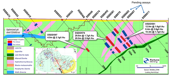 | DSDD574: | 1.7 g/t Au over an estimated true width of 29.6 meters from 93 meters 2.0 g/t Au over an estimated true width of 20.0 meters from 135 meters, including 18.4 g/t Au over an estimated true width of 0.8 meters from 158 meters |