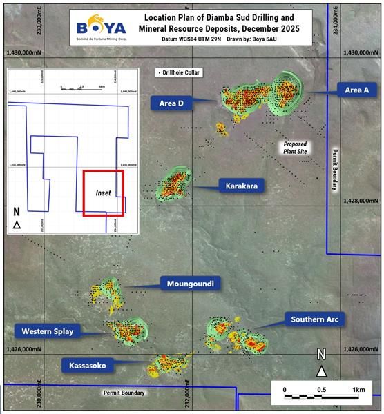 Figure 1: Location plan showing Diamba Sud drilling and Mineral Resource Deposits