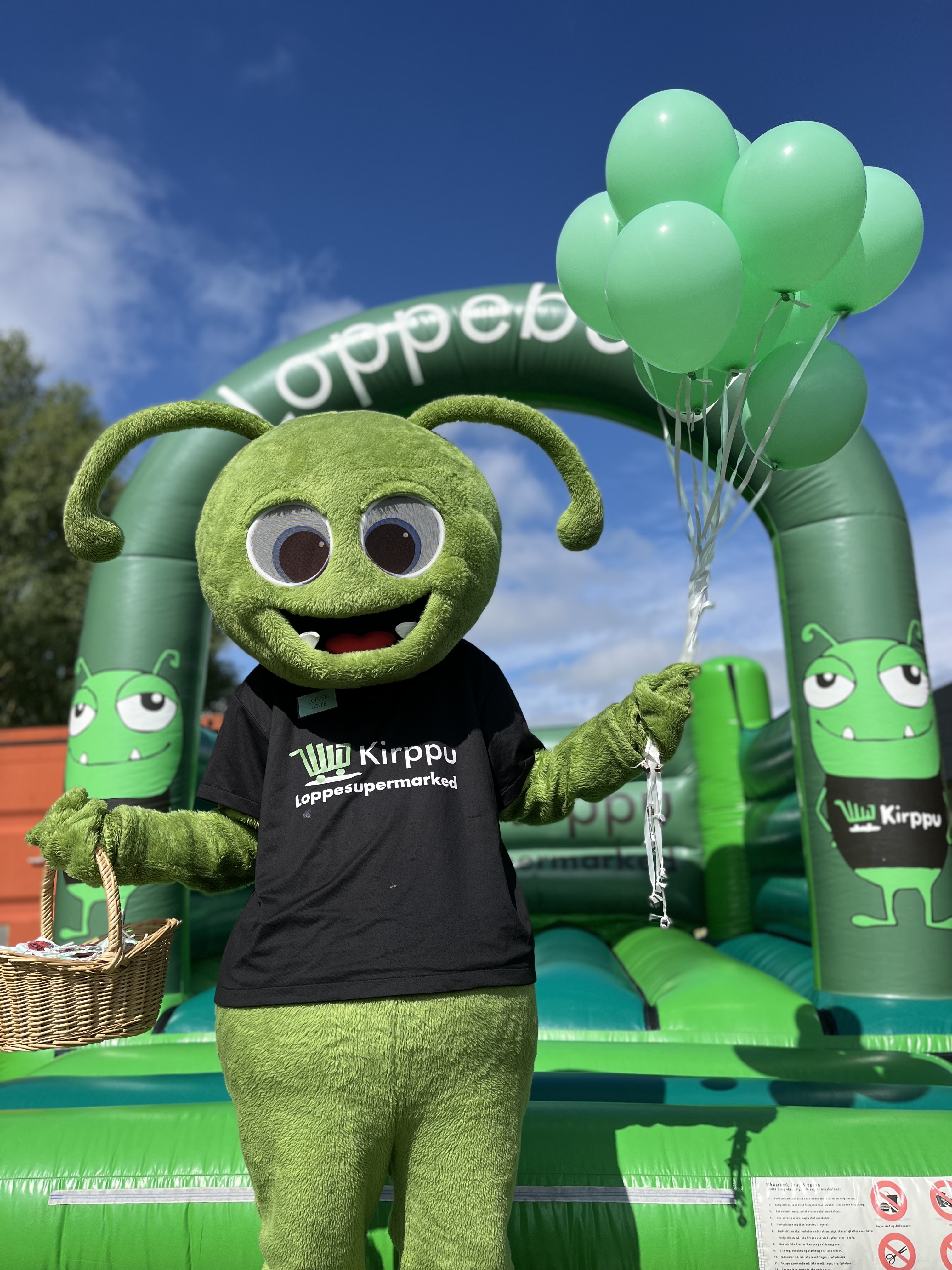 Sjove børneaktiviteter, hoppeborg og besøg af Kirppus grønne loppemaskot, Louie
