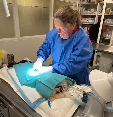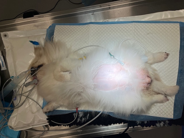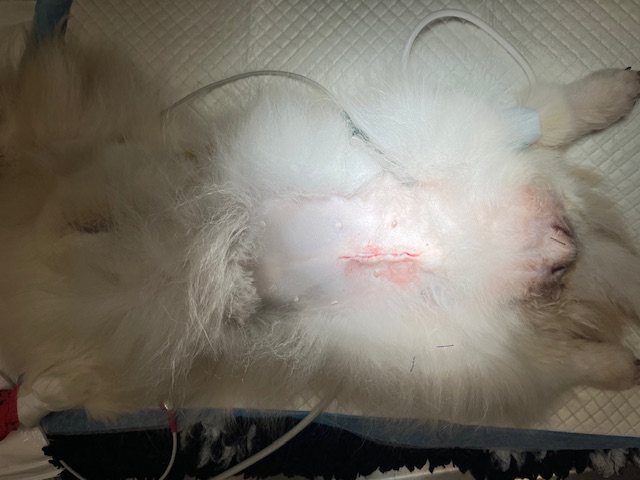 Og herfra gik det stærkt. Et hurtigt opkald til Årslev Dyrehospital for at høre, om vi måtte låne en operationsstue til Gerdas operation. Det sagde de heldigvis ja til, så Frynseklinikken kørte efter dagens konsultationer til Årslev og opererede Gerda.