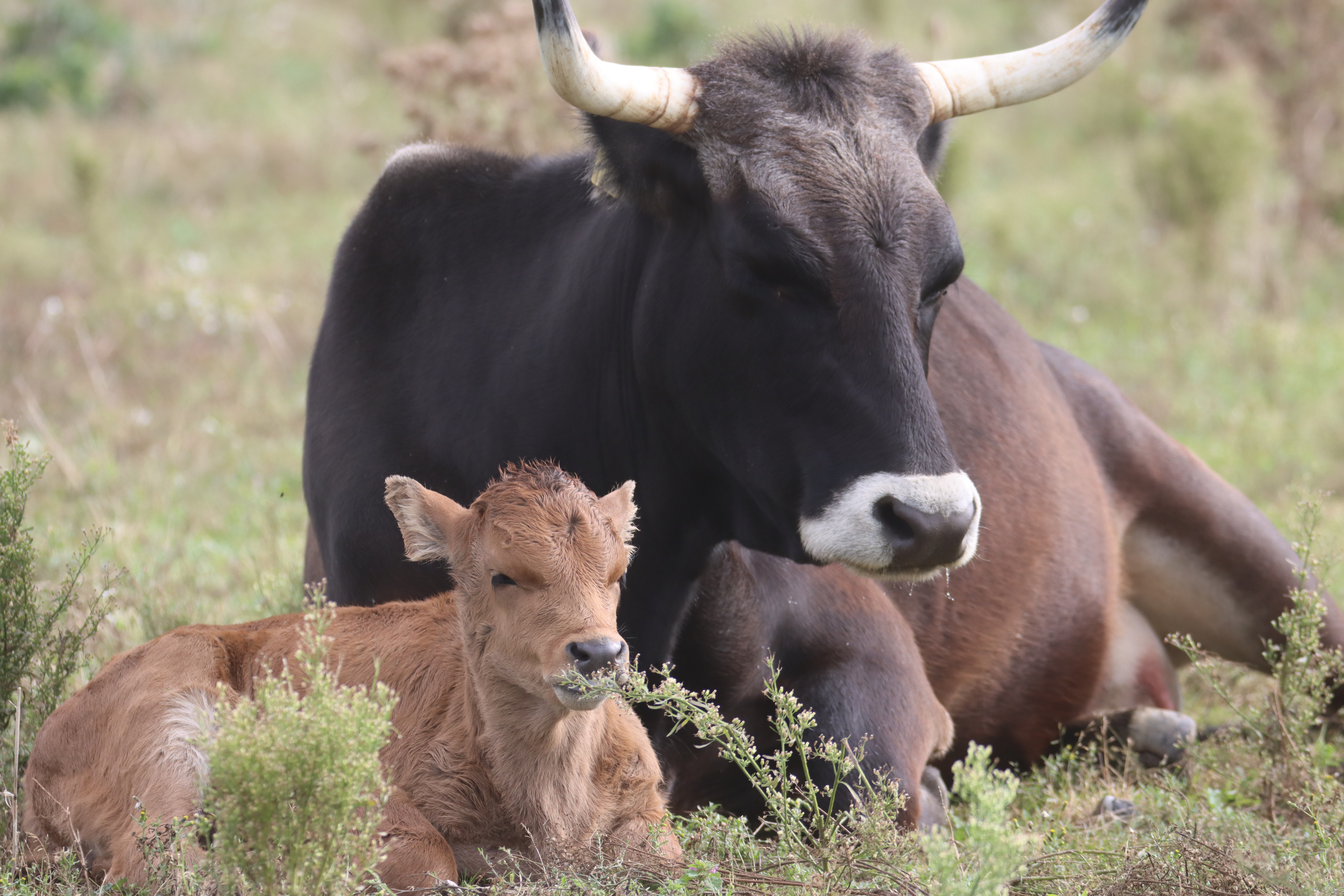 En tauros og hendes kalv hviler i græsset i Saksfjed Vildmark.