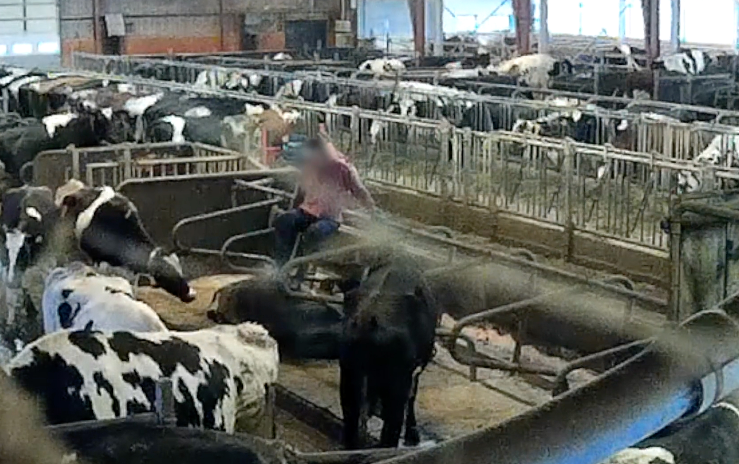 Optagelserne fra Arla-gården viser bl.a. køer, der bliver sparket og slået gentagne gange med en rive, og kalve som bliver sparket ind i små bokse.