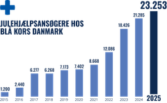 I alt 10.991 familier får julehjælp i år, hvilket er samme niveau som sidste år. Blå Kors Danmark har modtaget 23.253 ansøgninger i år. Det er det højeste antal nogensinde og et tydeligt tegn på, at behovet fortsat vokser.