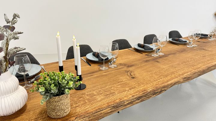 Bordet er et smukt eksempel på et langt plankebord med tydelig struktur, markante årer og et udtryk, der passer både i moderne og klassiske hjem. Et bord i denne størrelse bliver hurtigt hjemmets midtpunkt med plads til både gæster og hverdagsstunder.