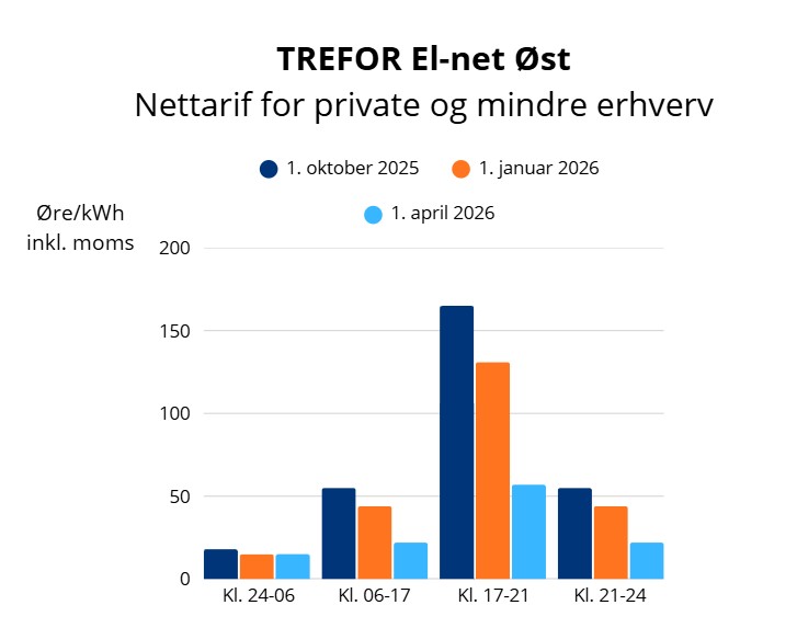 TREFOR El-net Øst forsyner samtlige 29.000 private boliger, fritidsboliger, ejendomme og erhverv på Bornholm. Over et døgn varierer nettariffen i en fast model. Prisen er lavest om natten, og højst i elnettets ”kogespids” fra klokken 17 til 21, hvor mange kommer hjem fra arbejde, laver mad og bruger strøm i hjemmene. Den 1. april skifter nettariffen til den lave sommerpris.