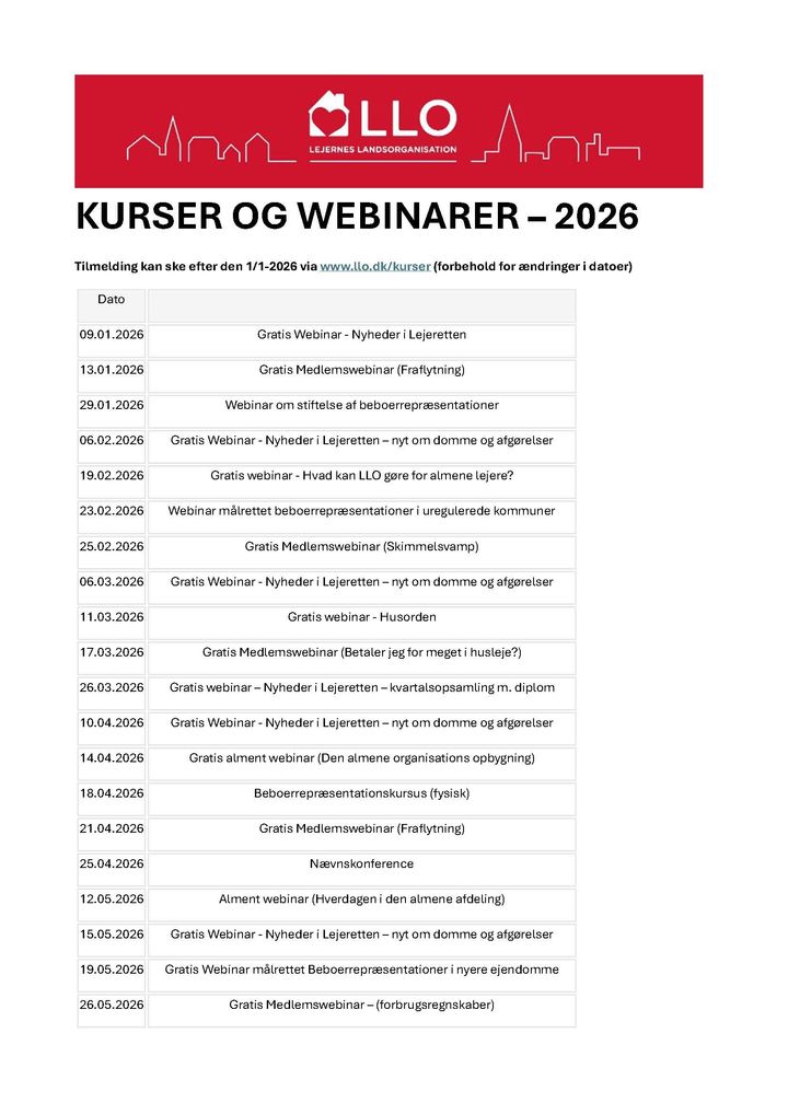 Som led i LLO’s indsats for at styrke viden på området udsender LLO et nyhedsbrev om domme og afgørelser og tilbyder en række populære og gratis webinarer – blandt andet Nyheder i lejeretten - især målrettet til nævnsmedlemmer. Kursuskatalog og tilmelding kan ske fra januar 2026 på www.llo.dk/kurser.