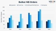 - Newbuilding orders contracting in several sectors, driven geopolitics, tightened supply of ships, and uncertainty around alternative fuel technologies.