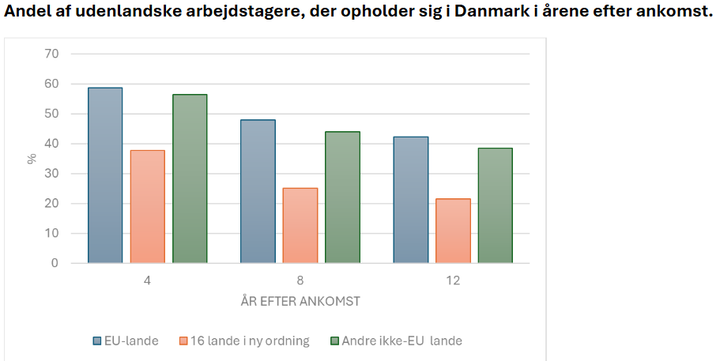 Der er derfor langt færre udenlandske arbejdere fra ikke-EU-lande, som bliver boende i Danmark, end der er blandt arbejdere fra EU.