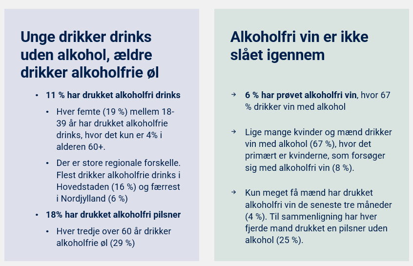 Halvt så mange kvinder har drukket en alkoholfri pilsner i samme periode. Til gengæld har flere kvinder end mænd, 14 procent, drukket alkoholfri drinks eller cocktails i samme periode.