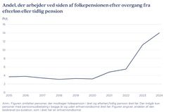 - Det er værd at bemærke, at personer, som har været på efterløn eller tidlig pension, før folkepensionsalderen, i stigende grad begynder at arbejde, når de bliver folkepensionister. Det hænger formentlig sammen med, at mens det ikke udløser modregning at arbejde som folkepensionist, så risikerer man at blive modregnet i efterløn og tidlig pension. Det betyder, at man får mindre i offentlig ydelse, hvis man arbejder. Det afholder formentlig mange fra at arbejde samtidig med, at de modtager efterløn eller tidlig pension, siger Andreas Østergaard Hartington.