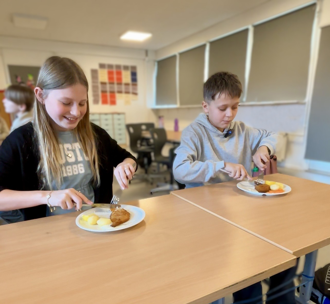 Malucca Valentin-Andersen  og Malthe Egholm fra 5. klasse på Vesterlandsskolen, afdeling Fuglebjerg spiser fiskefilet med kartofler, gulerødder og citron- og dildsauce. Menuen for en uge lyder på: tre dage med vegetarret, en dag med fisk og en dag med kød.