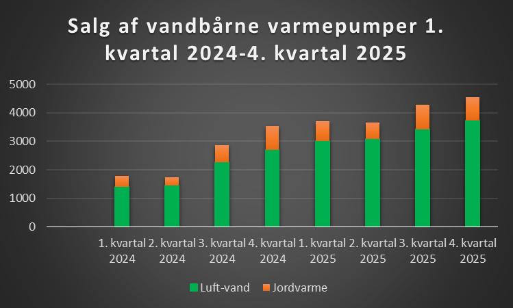 I 2025 blev der solgt mere end 16.000 luft/vand-varmepumper og jordvarmeanlæg. Det svarer til en stigning på cirka 65 procent i forhold året forinden, viser de nye officielle salgstal.