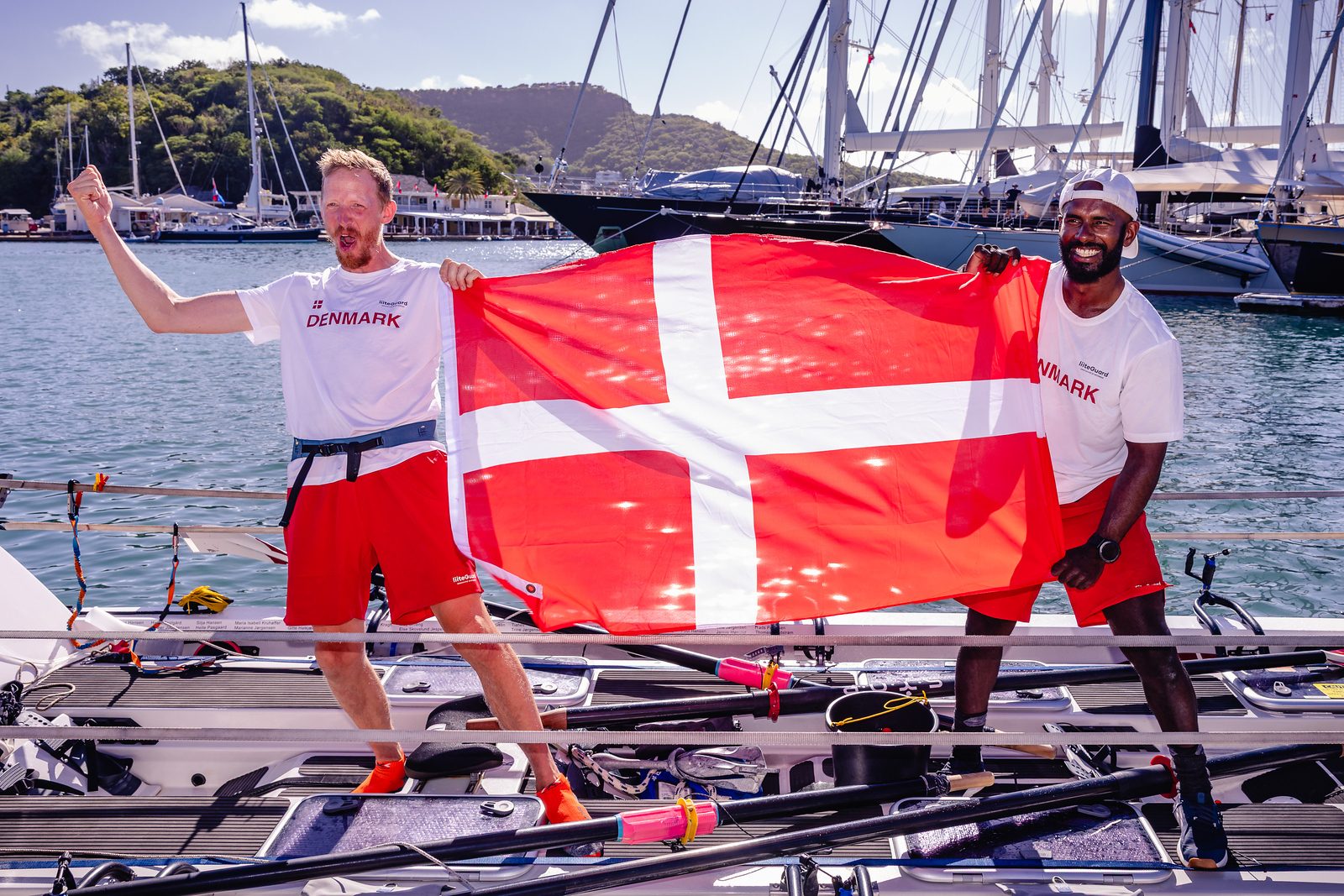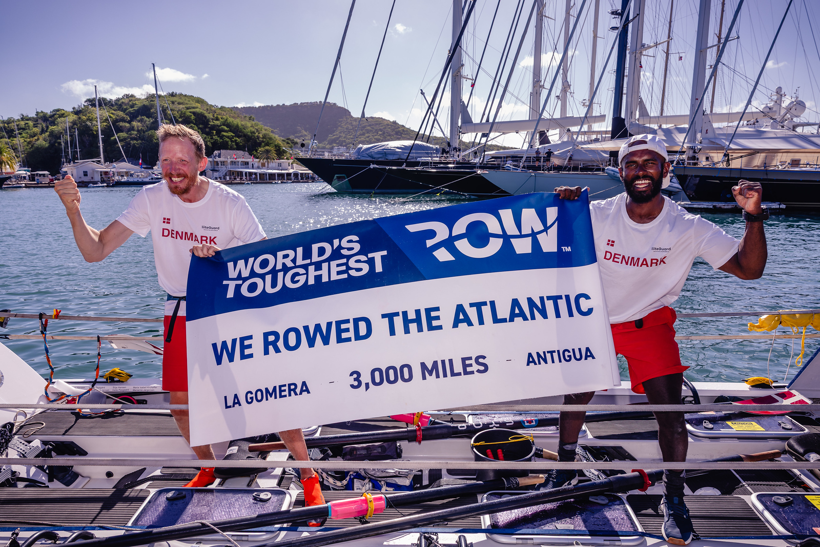 Det tog 43 døgn, 1 time og 35 minutter. De startede som en trio og krydsede mållinjen som en duo. Sammen har Simon fra Faxe Ladeplads og Zax fra Holstebro gjort det utrolige. På kajen på Antigua ventede børn og familier med længsel på det første kram – og mandag eftermiddag kunne de to udmattede og glade roere endelig sætte fod på fast grund igen.