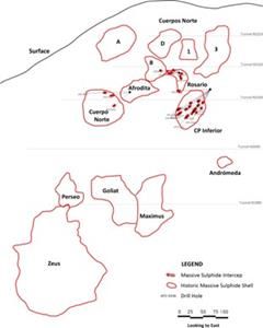Image 2: Detailed view of mineralized shells based on historical massive and new bodies at the El Roble Mine with intercepts from the current drill program