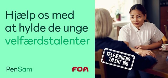 For niende år i træk afholder PenSam og FOA Velfærdens Talent 100. Med prisen hylder vi de mange unge talenter, der arbejder i velfærdsfagene, og som hver dag gør en uundværlig forskel for andre. Kender du et velfærdstalent under 36 år, som fortjener ekstra anerkendelse for sit store engagement og sin faglighed? Så nominér talentet frem til den 31. marts 2026.