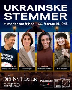 "In a time when our culture, identity and sovereignty can suddenly be threatened in a single sentence, it is crucial that we stand together, show loyalty and insist on our right to speak in complete, unbroken sentences. Det Ny Teater is proud to be able to host an evening of solidarity, where we both make room for – and learn more about – Ukrainian cultural life, which is currently living under extremely difficult conditions."