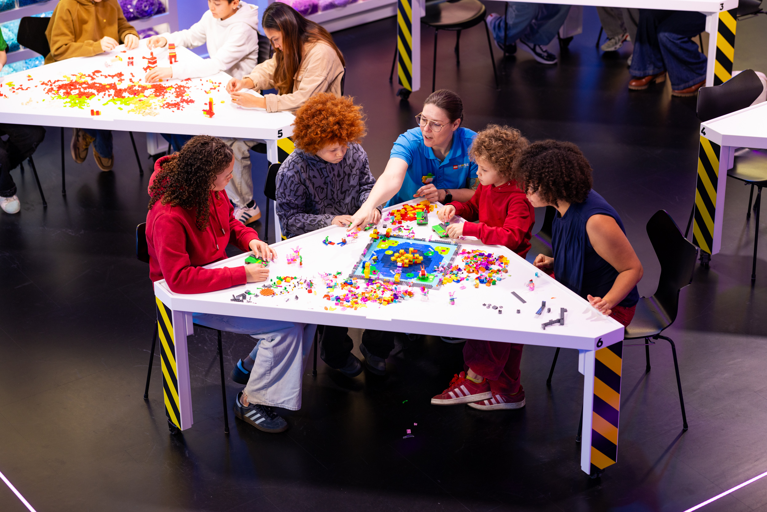 Mens gæsterne bygger individuelt, indeholder sessionerne legende øjeblikke, hvor bordene mødes gennem lette udfordringer og skaber en afslappet og social LEGO legeoplevelse.