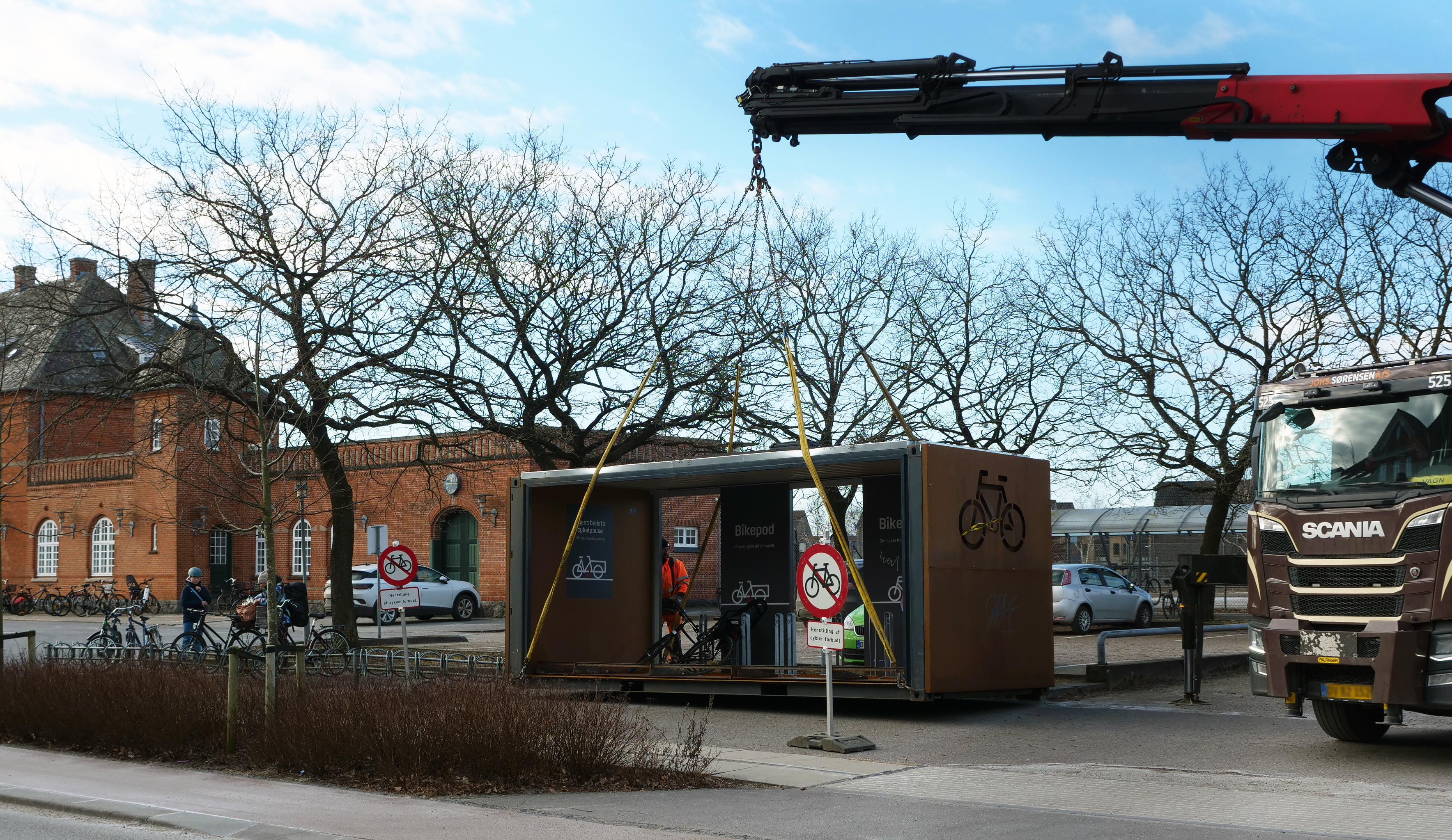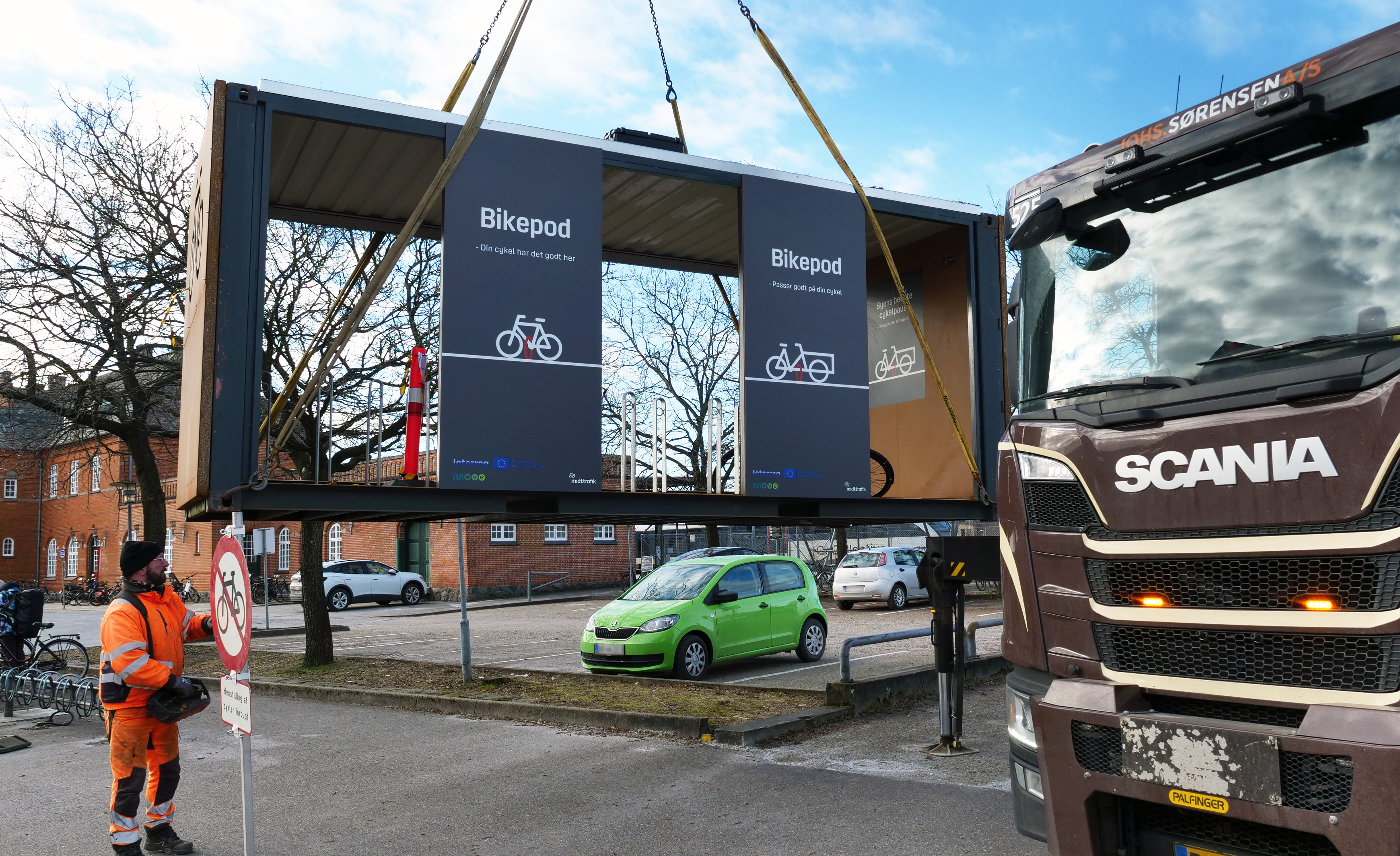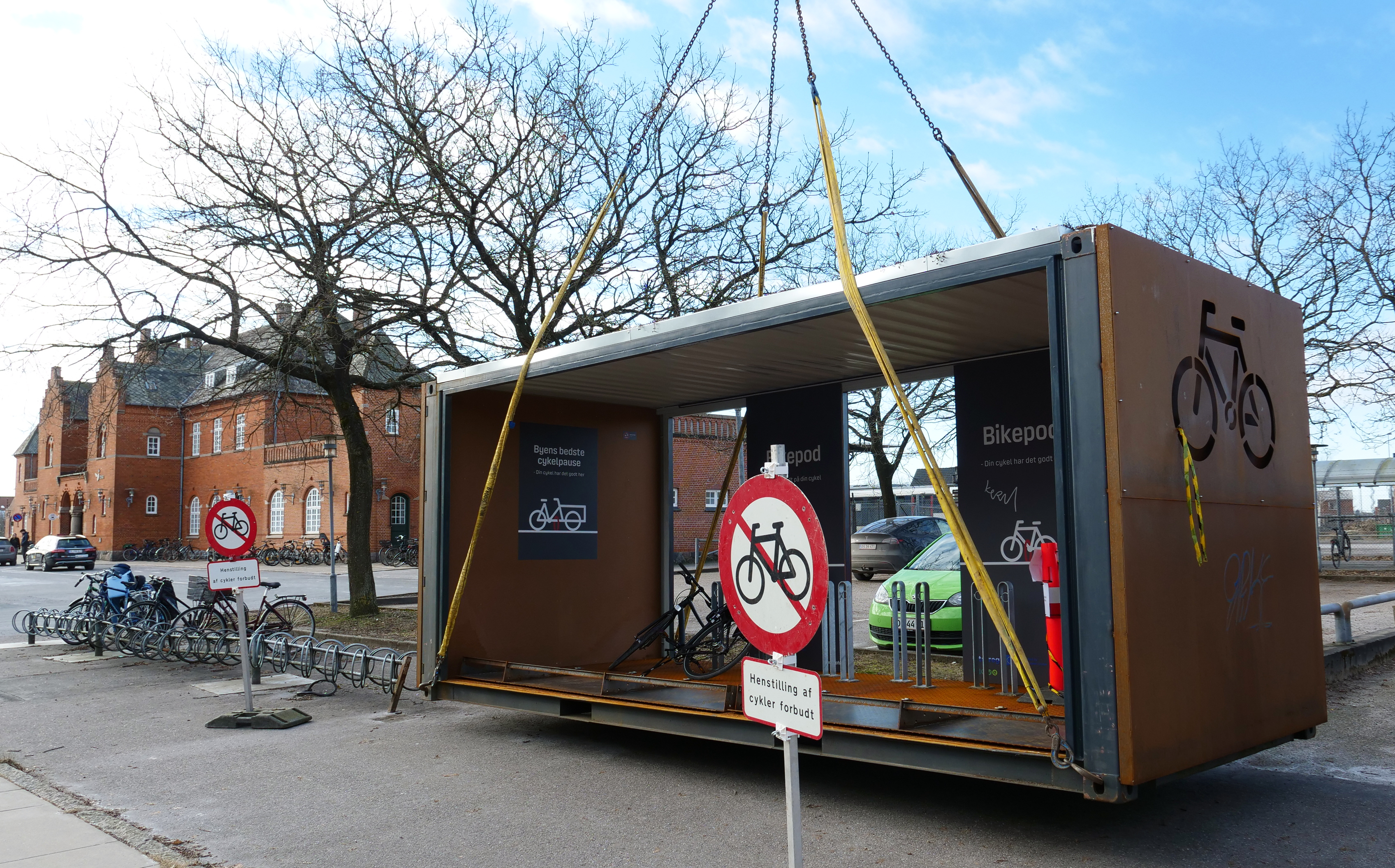 Tirsdag formiddag blev Danmarks første BikePod løftet ind på pladsen ved Holstebro Station til glæde for tog- og buspendlere, der nu kan parkere deres cykler i en helt ny form for cykelparkering.