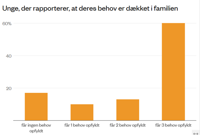 13 % af de unge rapporterer, at to af de tre behov er opfyldt, 10% at kun et behov er opfyldt og 17% angiver, at de slet ikke får opfyldt nogen af de tre centrale behov i deres familie.