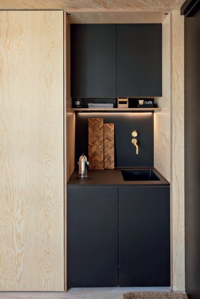 Køkkenet er et lille minikøkken med bordplade m/vask, lille køleskab, skuff eskab og overskabe. Kogeplade m/to blus og microovn er mobile og opbevares i skab