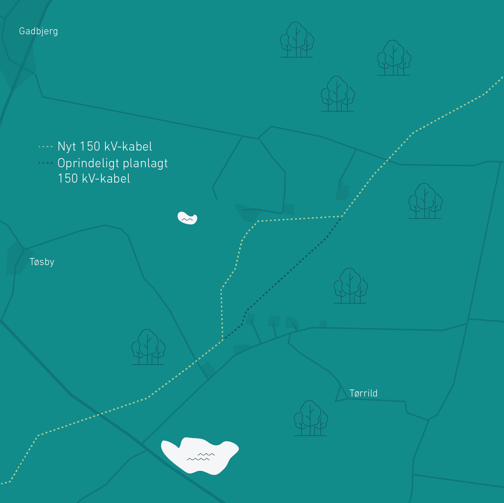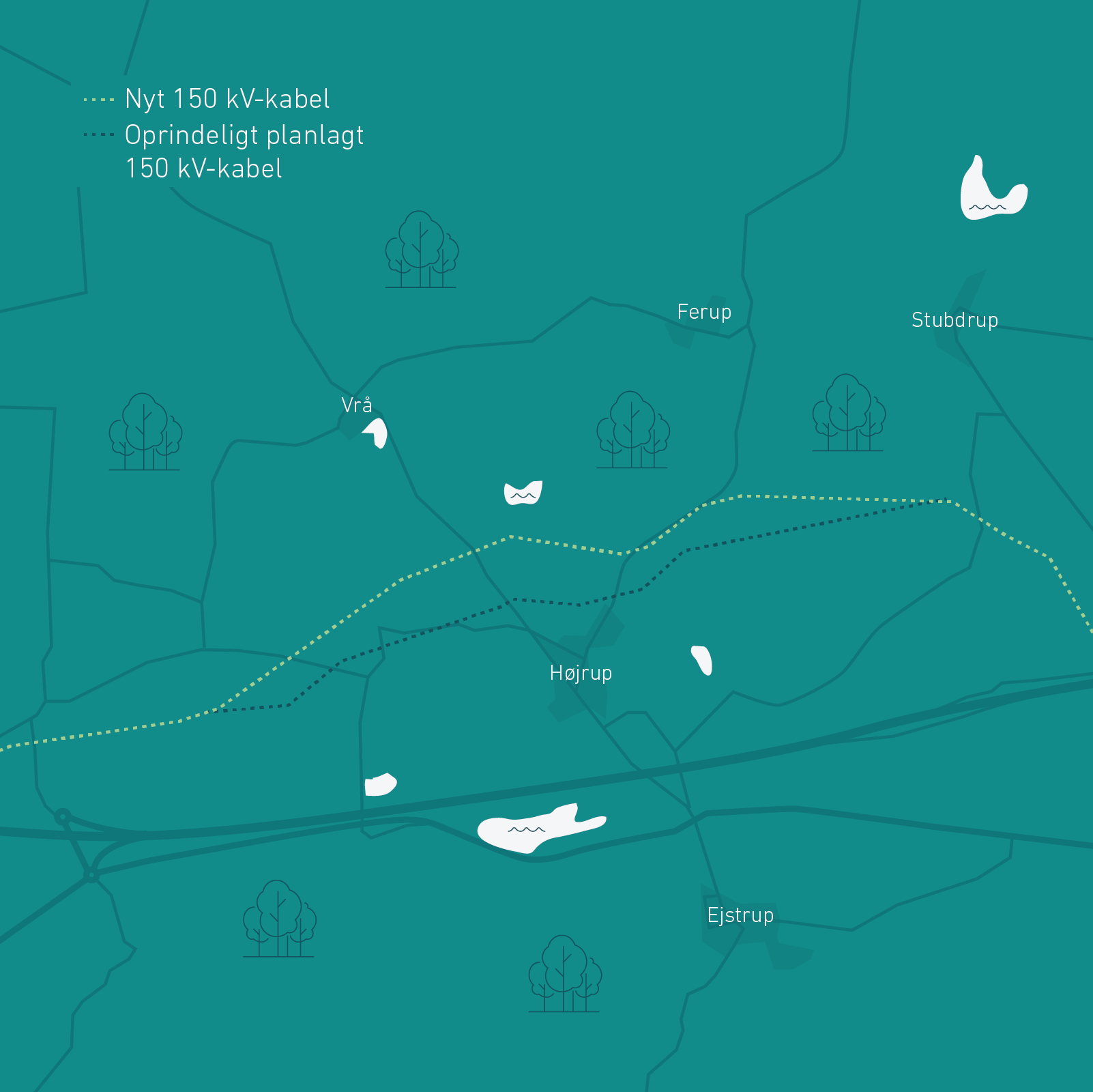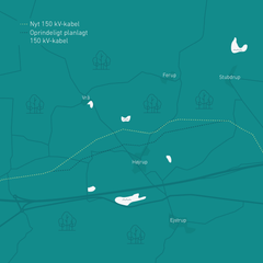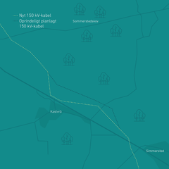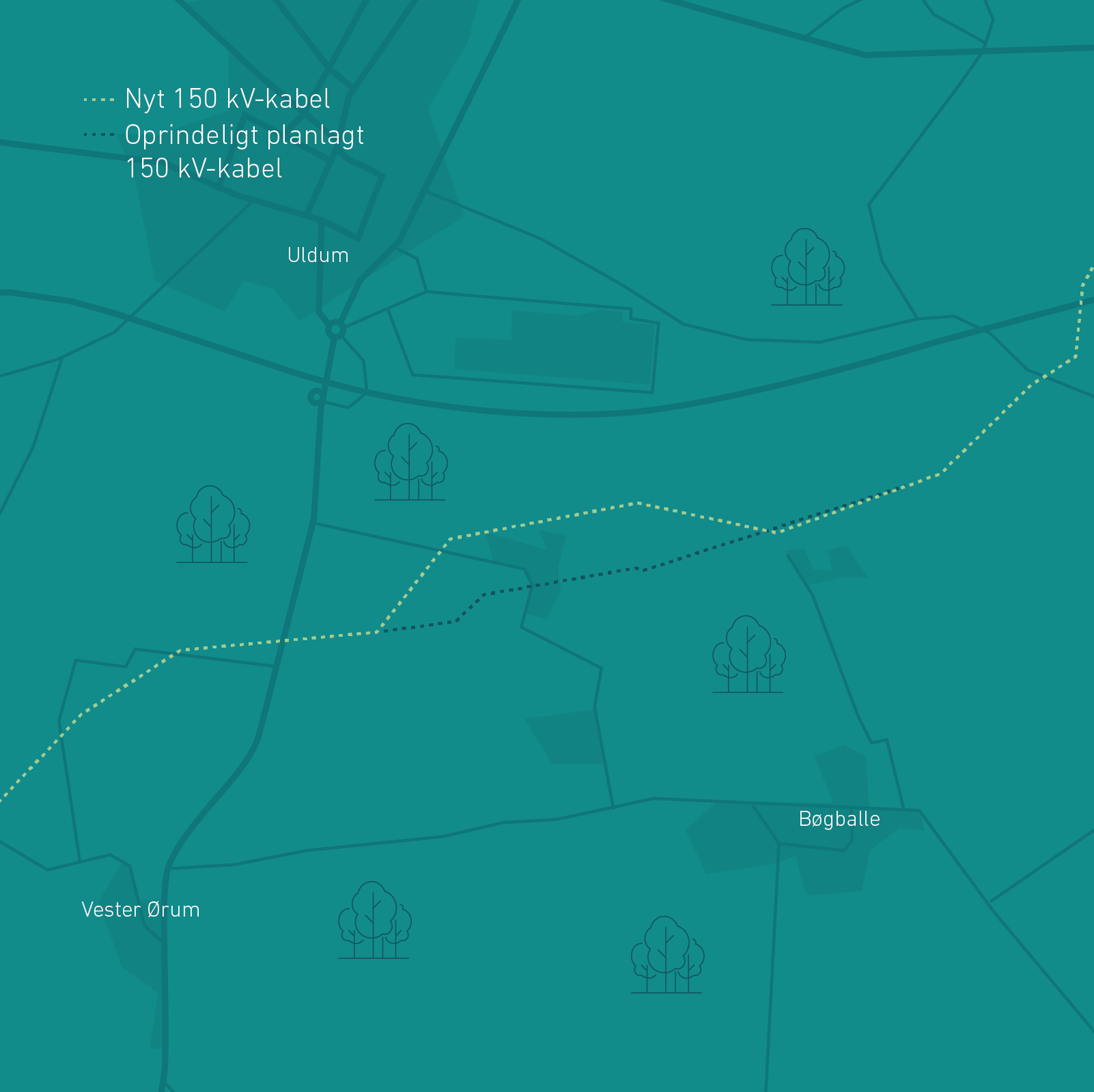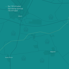 Det nedgravede 150 kV kabel syd for Uldum er flyttet lidt nordpå. Ændringen skyldes oplysninger fra lodsejer, der har planer om skovrejsning og etablering af søer på ejendom, der er central for kabelforbindelsens passage i området