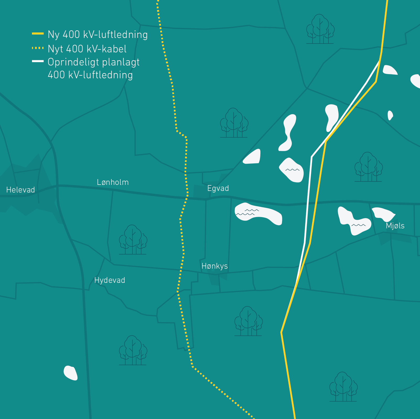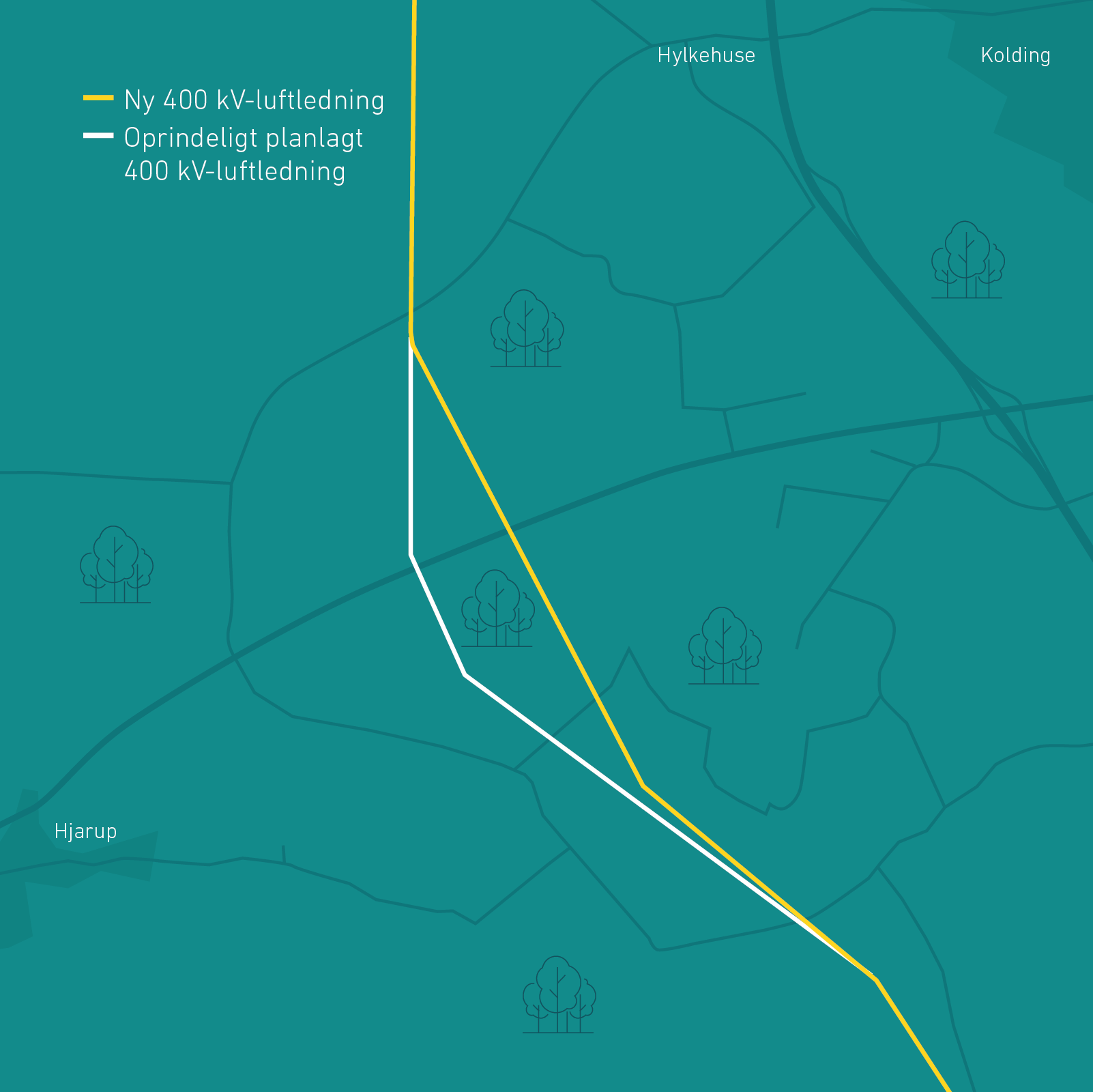 Illustration af to af i alt 20 større ændringer på linjeføringen af 400 kV og 150 kV forbindelser i Nyt elnet Aarhus-Aabenraa. Her er det ændring af kabel og luftledning vest for Aarhus. Find illustrationer vedhæftet og se interaktivt kort på projektets hjemmesiden www.energinet.dk/aarhus-aabenraa