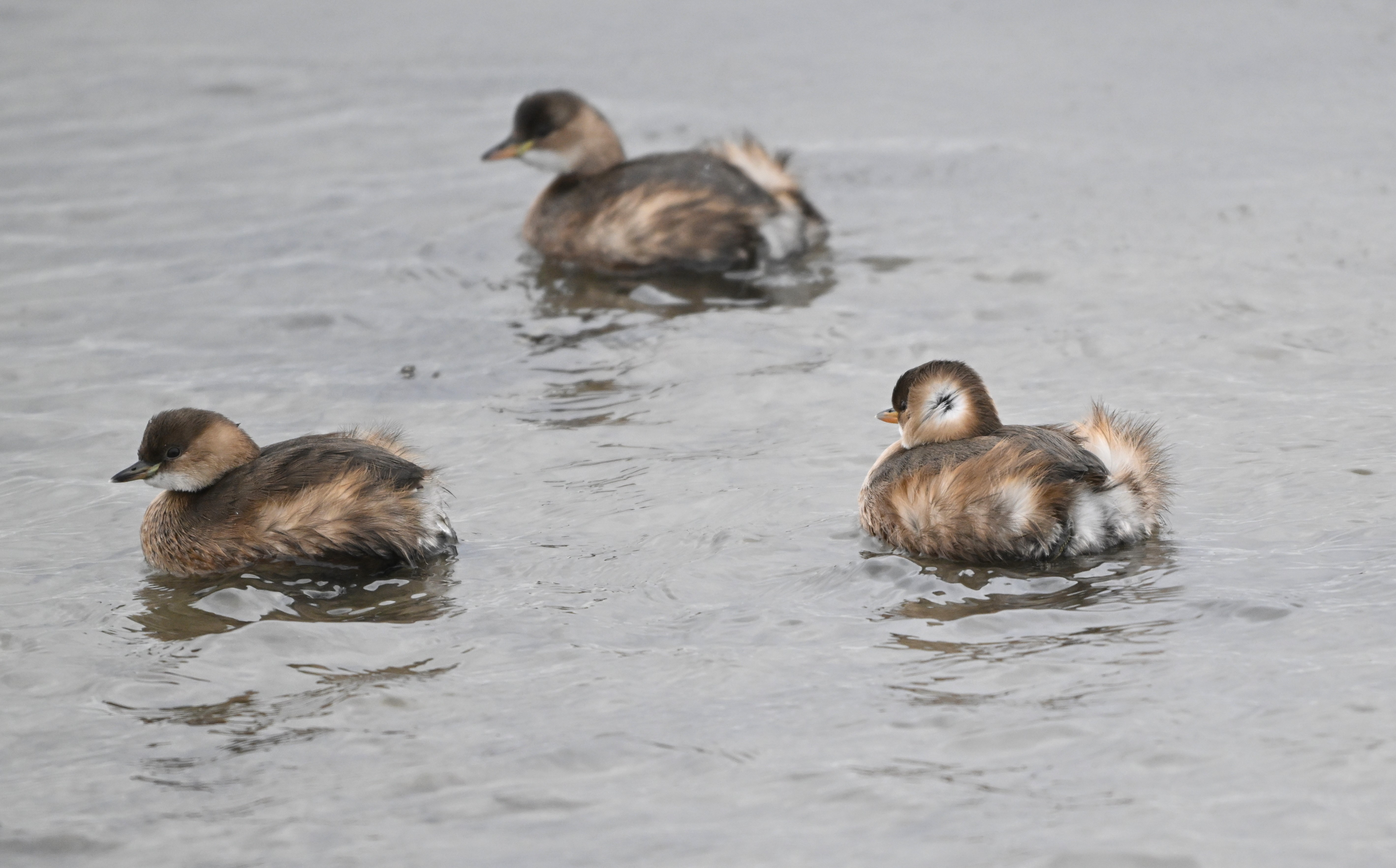 De ligner grå ællinger, men der er tale om små lappedykkere i vinterdragter. I denne tid kan man mange steder i Danmark opleve arten i småflokke, der trængt af vinterens isdække i moser og søer er søgt ud til åbent vand. I havne, færgelejer, vandløb eller under broer med isfrit vand, kan man opleve lappedykkernes kamp for at klare sig gennem vinteren.