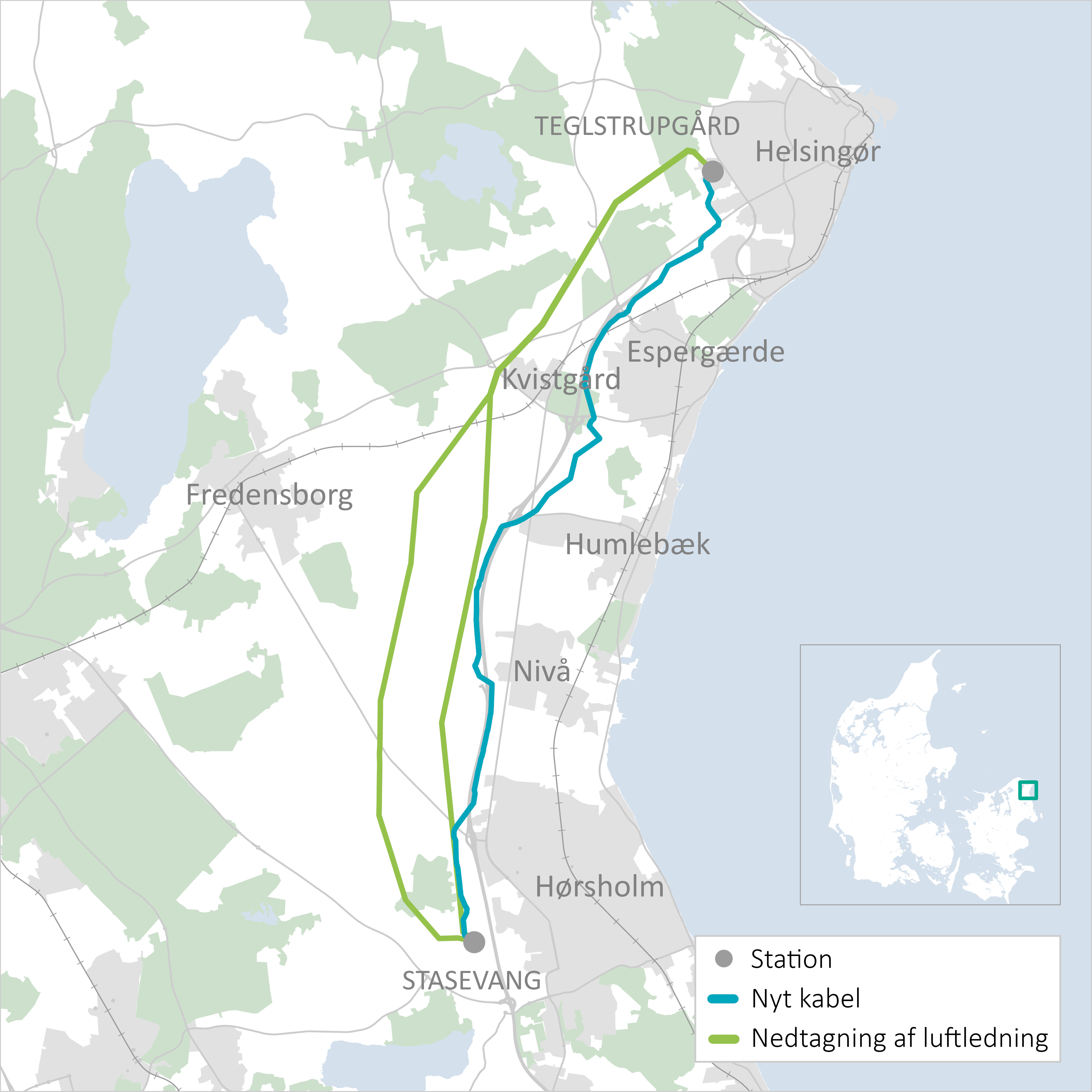 Energinet går snart i gang med de første anlægsaktiviteter på den nye 132 kV kabelforbindelse mellem Teglstrupgård ved Helsingør og Stasevang ved Hørsholm. Projektet skal forny og forstærke den eksisterende elforbindelse med nye, kraftigere kabler. Samtidig forskønnes området til gavn for natur og naboer, når de nuværende luftledninger og elmaster fjernes.