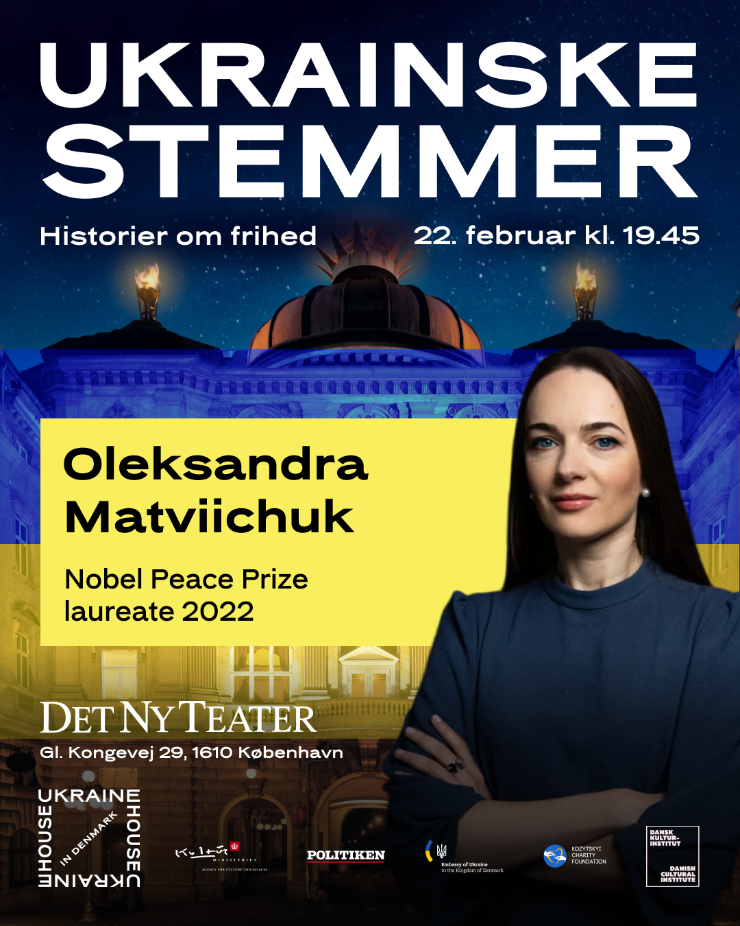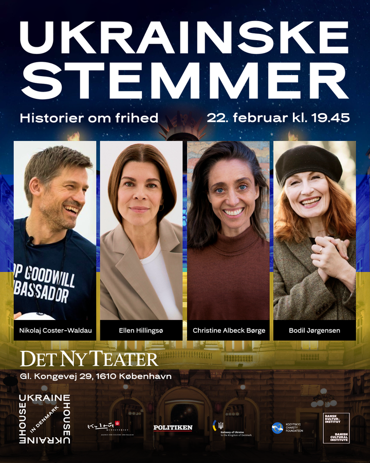 Den 22. februar 2026 inviterer Ukraine House in Denmark, Dansk Kulturinstitut og Det Ny Teater til ”Ukrainske Stemmer – historier om frihed”, en solidaritetsaften for Ukraine på tærsklen til fireåret for Ruslands fuldskalainvasion. På scenen kan bl.a. opleves den ukrainske nobelprismodtager Oleksandra Matviichuk, den danske verdensstjerne Nikolaj Coster-Waldau, Bodil Jørgensen, Ellen Hillingsø, Christine Albeck Børge, et 26 personers stort kammerorkester, samt en række ukrainske kunstnere.