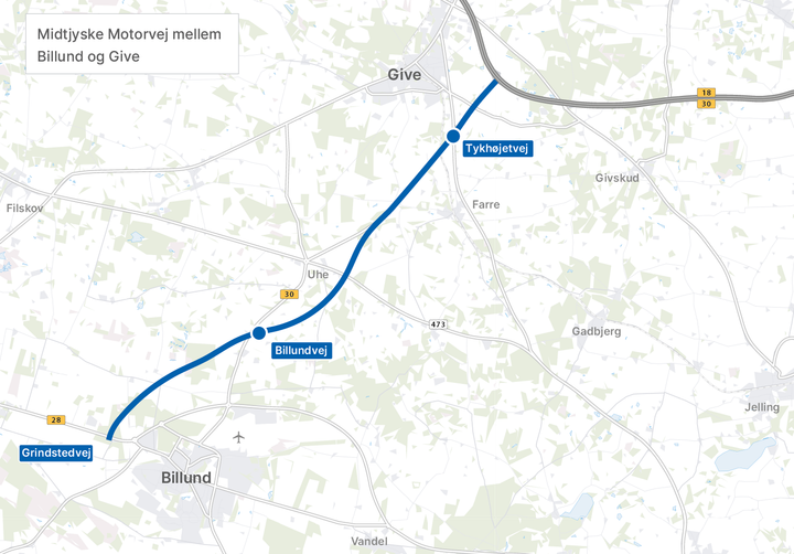 Den 9. december 2025 vedtog Folketinget anlægsloven for to strækninger af Midtjyske Motorvej. Den ene strækning kommer til at gå mellem Billund og Give, og med den politiske beslutning på plads, er Vejdirektoratet nu i gang med at planlægge anlæg af motorvejen.