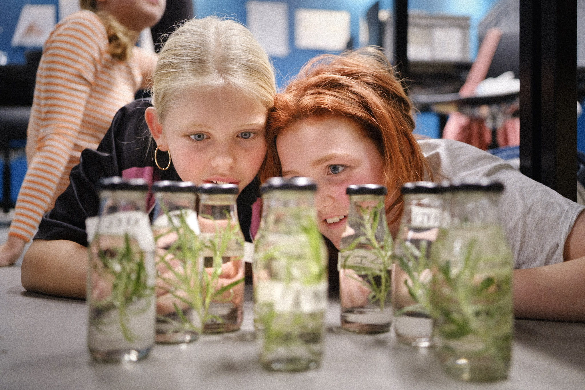 To piger kigger nysgerrigt på flasker med grønne planter i