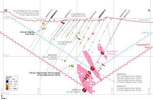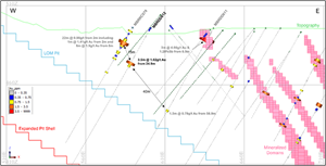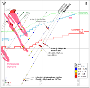 MBRDD616 and MBRDD619 intersected multiple gold mineralized zones at the lower boundary of the expanded pit shell and approximately 60m below the expanded pit shell (approximately 100m below the BRC3 current pit floor) (Figure 7). The area is sparsely drilled, open at depth and along strike. The deepest gold intersections in both holes potentially correspond to modelled mineralized domains approximately 80m to the north. The same mineralized domain was intersected by MBRDD600, MBRDD601 and MBRDD602 (Table 3) [2].