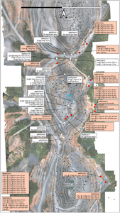 Figure 1. Plan view of the Buffalo Reef Central (BRC2, BRC3 & BRC4), showing results reported this announcement (orange callouts) along with previously reported results [2] (white callouts). Blue symbols are holes waiting for results. Drilling is generally orientated from east to west.