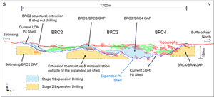 Figure 2. Long section A-A through Buffalo Reef Central depicting Mine Expansion target Areas (Stage 1 and Stage 2) targeted in the Mine Expansion Drilling, looking west.