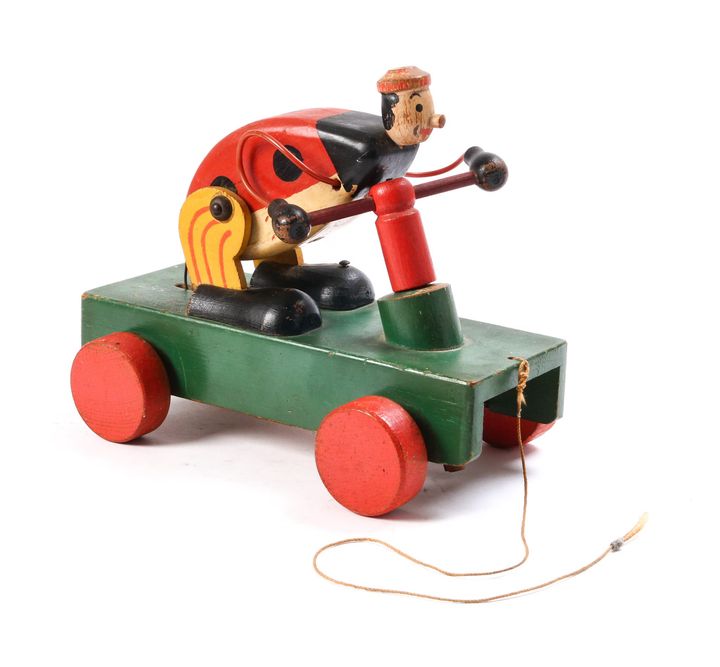 Den 21 cm lange træfigur, produceret i LEGOs tidlige år før plastklodsernes gennembrud, stammer fra virksomhedens pionerperiode, hvor trælegetøj udgjorde kernen i produktionen. Figuren er udstyret med lydfunktion og repræsenterer et sjældent og eftertragtet stykke dansk design- og legetøjshistorie.