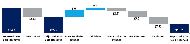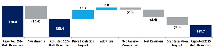 - Changes since 2024 are mainly driven by divestments (8.6 million ounces), followed by depletion from mining, reclassification of the Yanacocha Sulfides project reserves to resources, and cost escalation assumptions, offset by an increased gold price assumption, resource conversion and other positive revisions at Brucejack, Tanami, Lihir, Ahafo North and Ahafo South