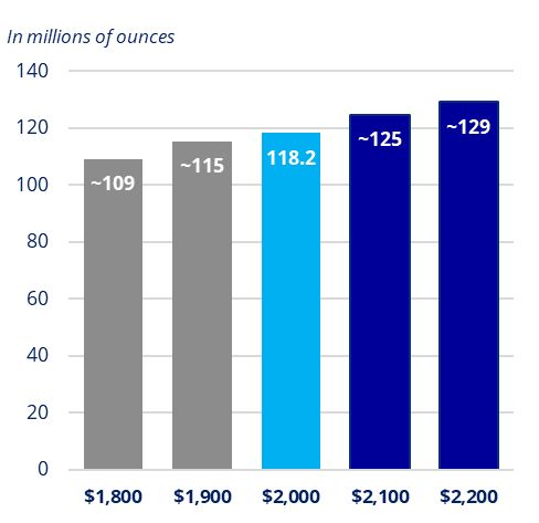 - Gold reserves are determined based on a gold price of $2,000 per ounce following the annual pricing review, more than 20 percent below the three-year trailing average price and well below the current spot price