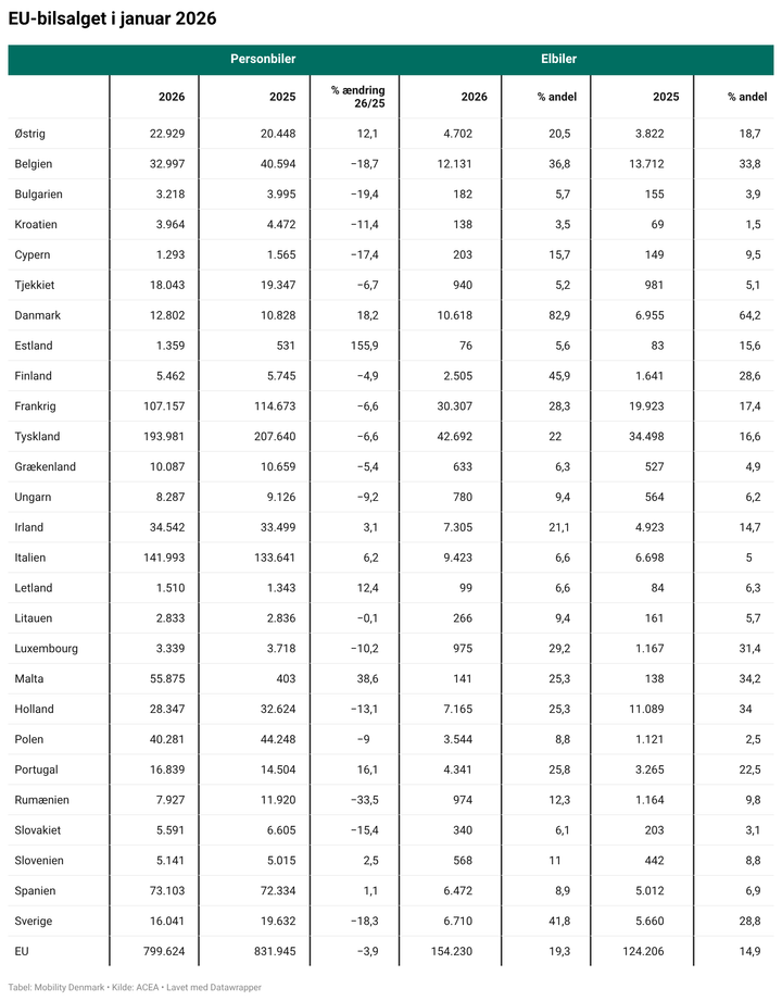 Der blev indregistreret 799.625 nye personbiler i EU i januar 2026. Det er et lille fald på 3,9 procent sammenlignet med januar sidste år, som skyldes en roligere start på flere af de store bilmarkeder sammenlignet med sidste år. I Danmark gik udviklingen dog i den modsatte retning. Her blev der indregistreret 12.802 nye personbiler i januar, hvilket svarer til en stigning på 18,2 procent sammenlignet med samme måned sidste år.