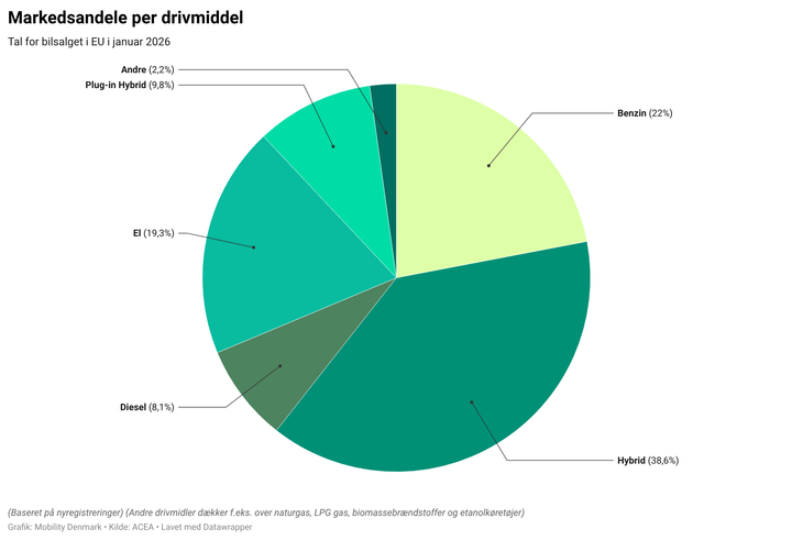 Elbilerne oplevede fin fremgang ved årets begyndelse. I januar blev der indregistreret 154.230 nye elbiler i EU. Det er en stigning på 24,2 procent sammenlignet med januar 2025. Elbilerne udgjorde dermed 19,3 procent af alle nye biler i EU mod 14,9 procent året før. Næsten hver femte nye bil i EU kører nu på el.