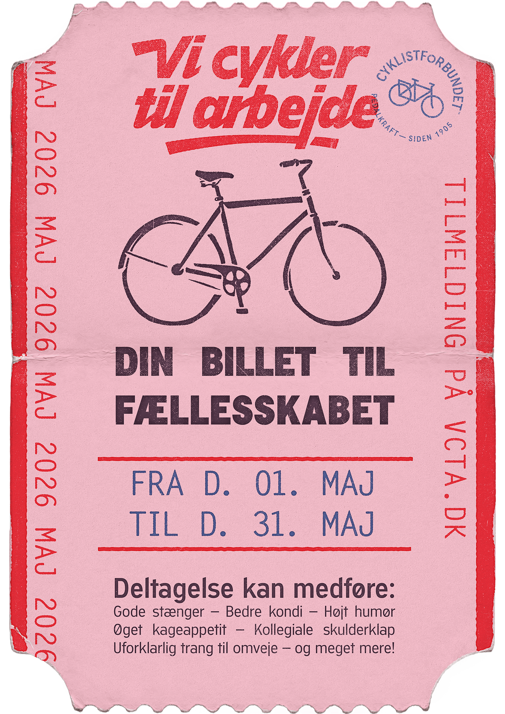 Til maj er det tid at cykle til arbejde igen - hvis du da ikke gør det i forvejen. ‘Din billet til fællesskabet’ lyder årets slogan, der understreger, hvad Cyklistforbundets Vi Cykler til Arbejde-kampagne 2026 handler om.