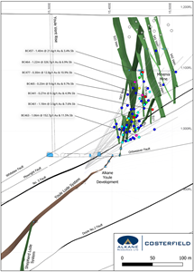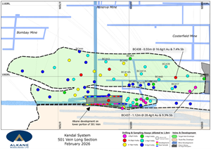 Figure 4. Long Section of the Kendal 501 Vein with high grade assays highlighted. The lower portion of the 501 vein has already been accessed by Alkane, and diluted face grades are shown alongside drilling intercepts.
