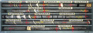 - 267.5 g/t gold and 5.6 % antimony over 2.3 m (ETW 1.22m) in BC464