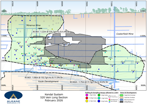 Figure 5. Long Section of the Kendal 520 Vein with high grade 2025 assays highlighted. The section shows the strong continuity of the Kendal system outside of the historically mined sections, both vertically and along strike.