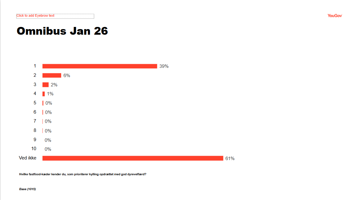 Dokumentation. Meningsmåling fra YouGov viser, at 33 procent ville fravælge restauranter, hvis de vidste, at de tilbyder dårlig dyrevelfærd for kyllinger. 20 procent ville ikke købe noget med kyllinger, hvis de kendte til den lave standard for dyrevelfærd.