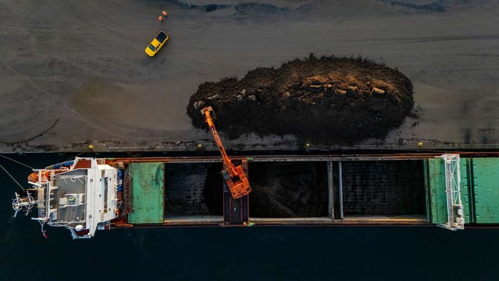 Når et skib har læsset 5.000 ton jord af på kajen et par kilometer fra byggepladsen, bliver der travlt med at fordele jorden over det store areal.