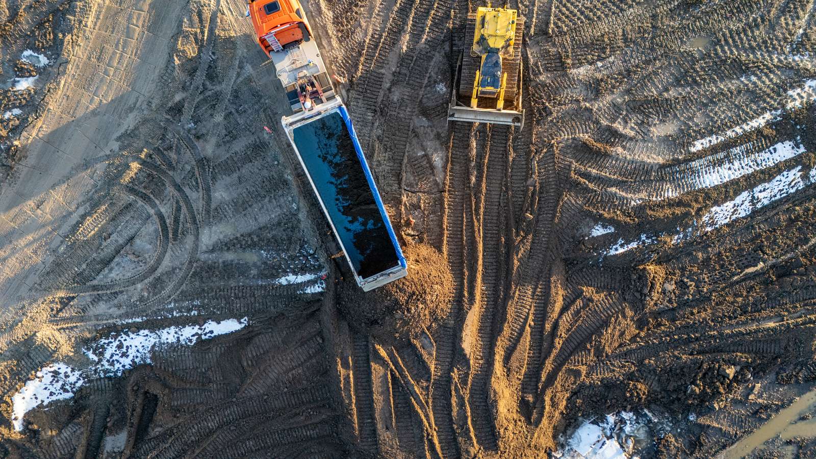Over walkie’en får chaufføren at vide, hvilken bås jorden skal tippes af i. Her holder en bulldozer klar til at jævne de 38 ton jord ud med det samme.