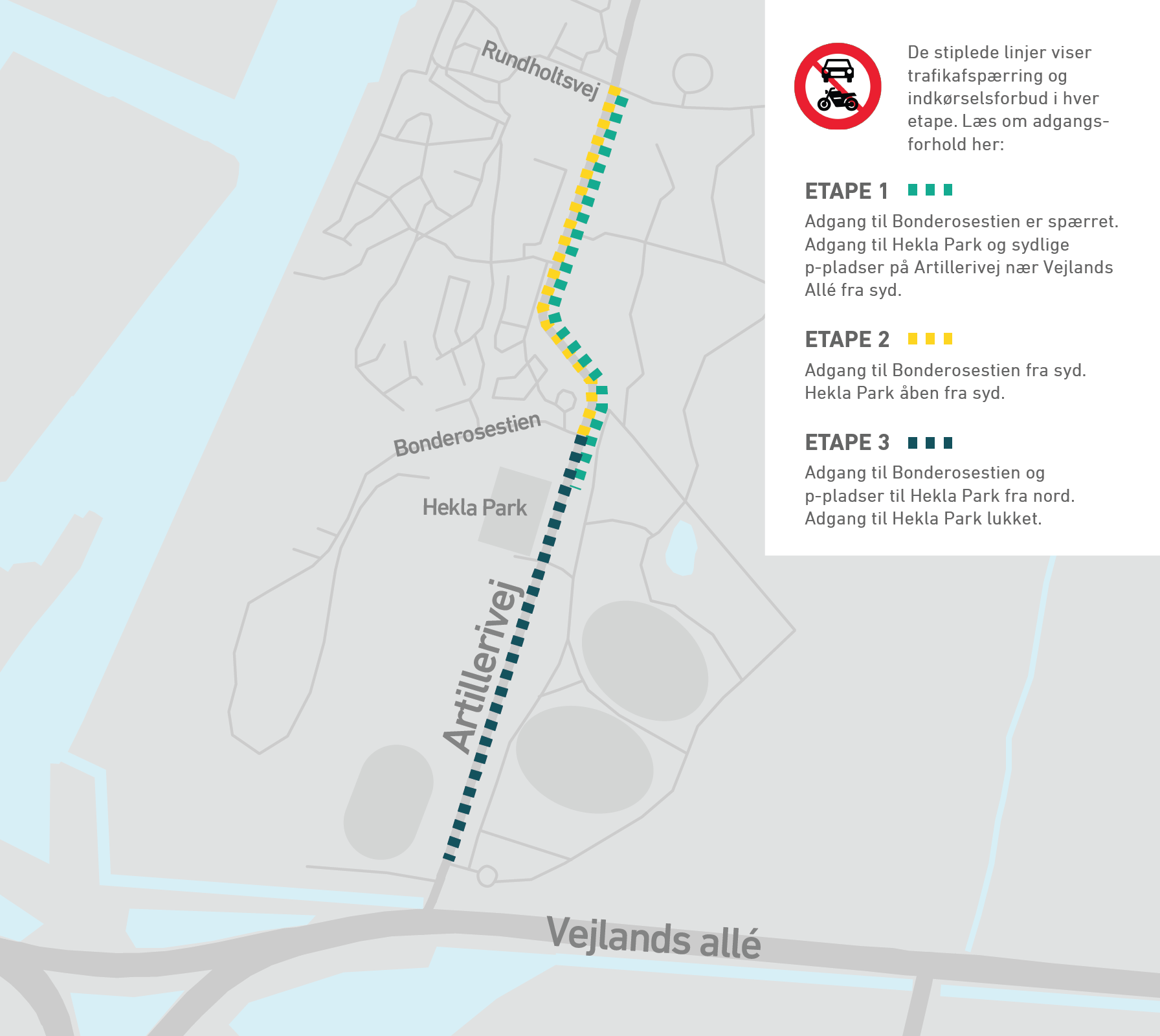 Arbejdet på Artillerivej gennemføres i flere etaper for at tage hensyn til brugere af Hekla Park og beboere i Haveforeningen Sønderbro. Målet er at sikre adgang til området, herunder fodboldbanerne ved Hekla Park samt indkørsel til Bonderosestien, der både fungerer som adgangsvej for Haveforeningen Sønderbro og som parkeringsområde for parkens brugere.