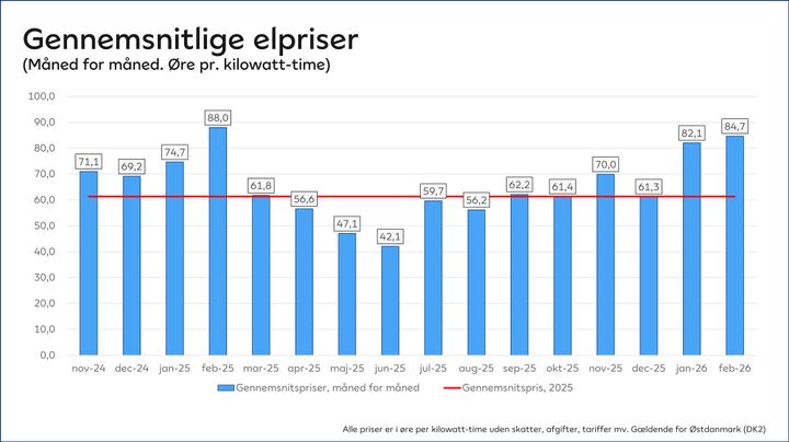Med en gennemsnitspris på ca. 84,7 øre per kilowatt-time har elprisen i Østdanmark ligget på det højeste niveau siden februar sidste år. Her var elprisen i gennemsnit oppe på ca. 88,0 øre. Hvis ikke elafgiften fra nytår var blevet reduceret fra 90 øre til 1 øre per kilowatt-time fra nytår, ville februar dermed have været den dyreste måned for østdanske elkunder i et år.