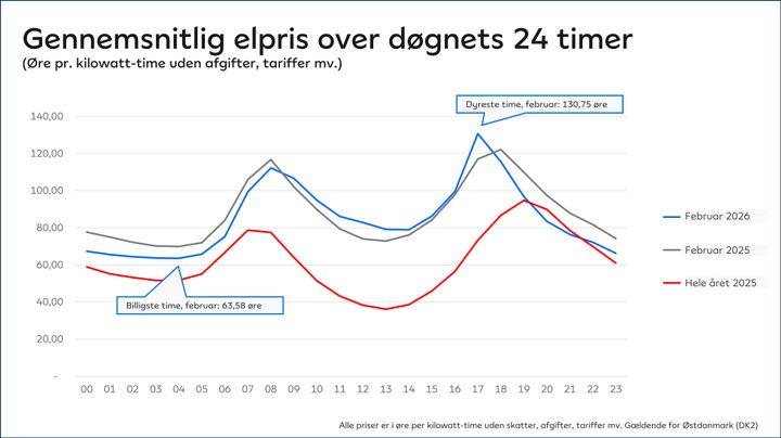 Det gælder også for februar. Her topper elpriserne i timen mellem kl. 17 og 18, hvor gennemsnits-prisen for hele februar var ca. 120 øre per kilowatt-time. Omvendt er døgnets billigste time mellem kl. 4 og 5 om natten. Her er gennemsnitsprisen nede på ca. 65 øre.