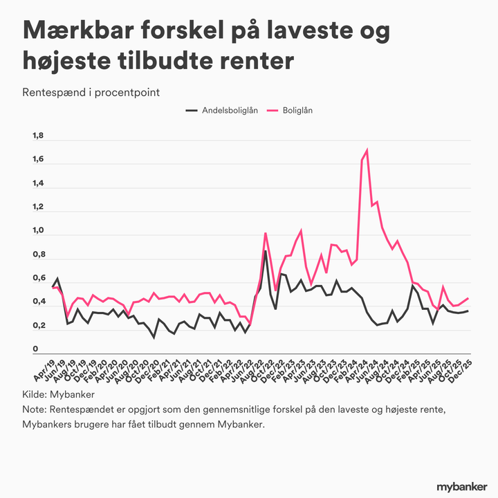 Den gennemsnitlige rente dækker over mærkbare forskelle på de højeste og laveste renter på lån, som Mybankers brugere er blevet tilbudt af bankerne. I februar lød den gennemsnitlige forskel på 0,5 procentpoint for boliglån og 0,4 procentpoint for andelsboliglån.